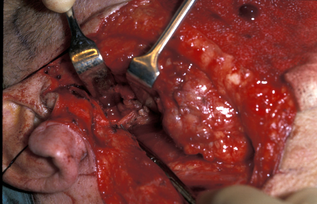 When the tumour is confined to the deep lobe of the gland (medial to the facial nerve and usually behind the posterior border of the ramus of the mandible), it may be necessary to osteotomise (cut) the ramus (vertical part of the jaw bone) and mobilise the segments to allow adequate three-dimensional access for safe excision of the tumour (see Figure 13).