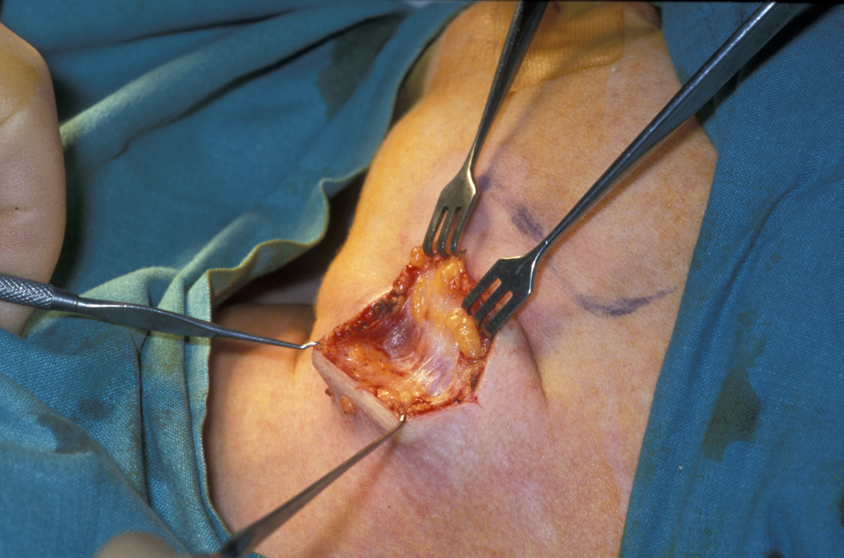 Submandibular gland excision is required after the gland has suffered irreparable damage from infection and/or obstructive disease. The surgical approach is by trans-cervical (from the neck) approach. The incision is two finger-breadths below the lower border of the mandible. A 3 to 4 cm incision is made. The incision is then deepened through fat that bleeds; bleeding needs to be controlled using bipolar diathermy to expose the platysma muscle (a broad sheet of muscle covering front and sides of the neck; see Figure 5).