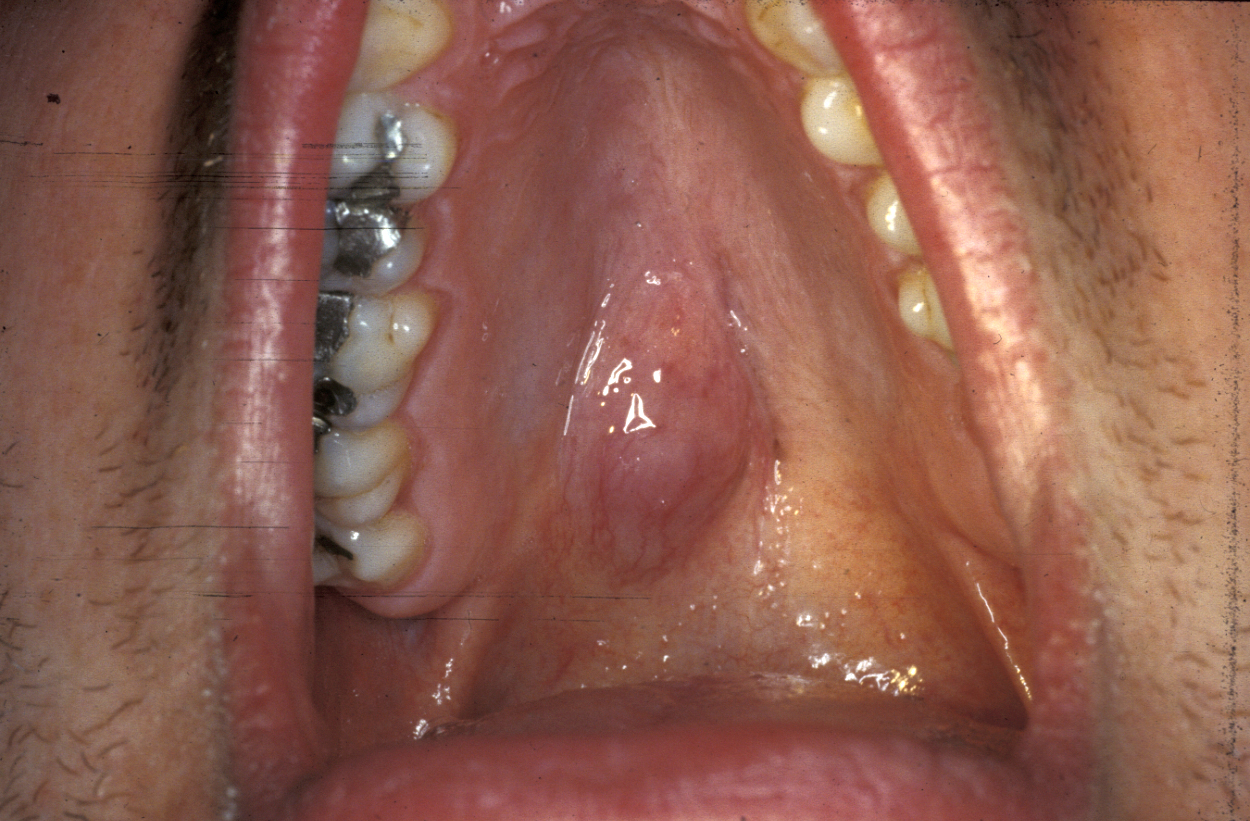 Another location where salivary gland pleomorphic adenoma may occur is in the palate area, most often at the junction of hard and soft palates (see Figure 7).